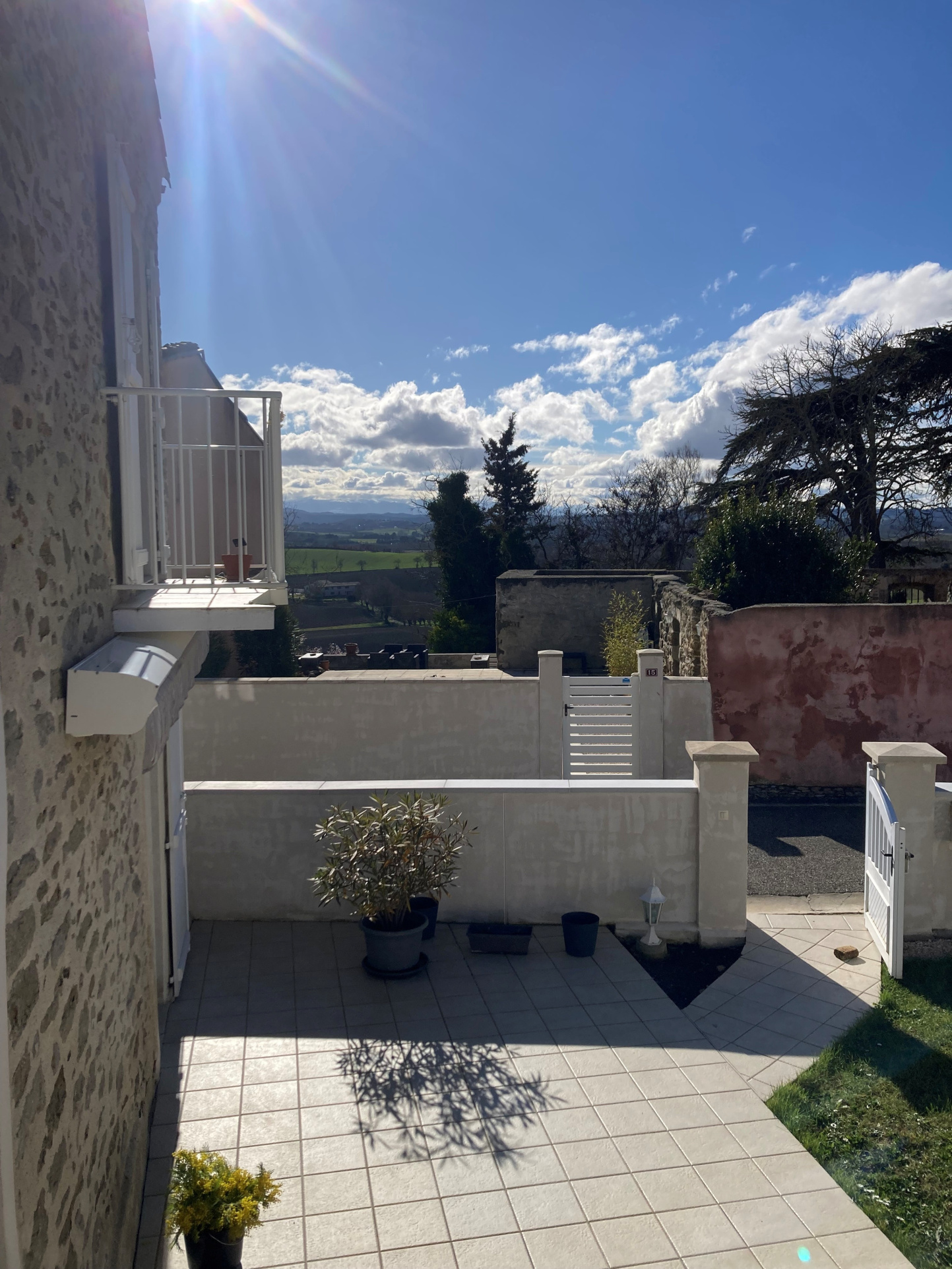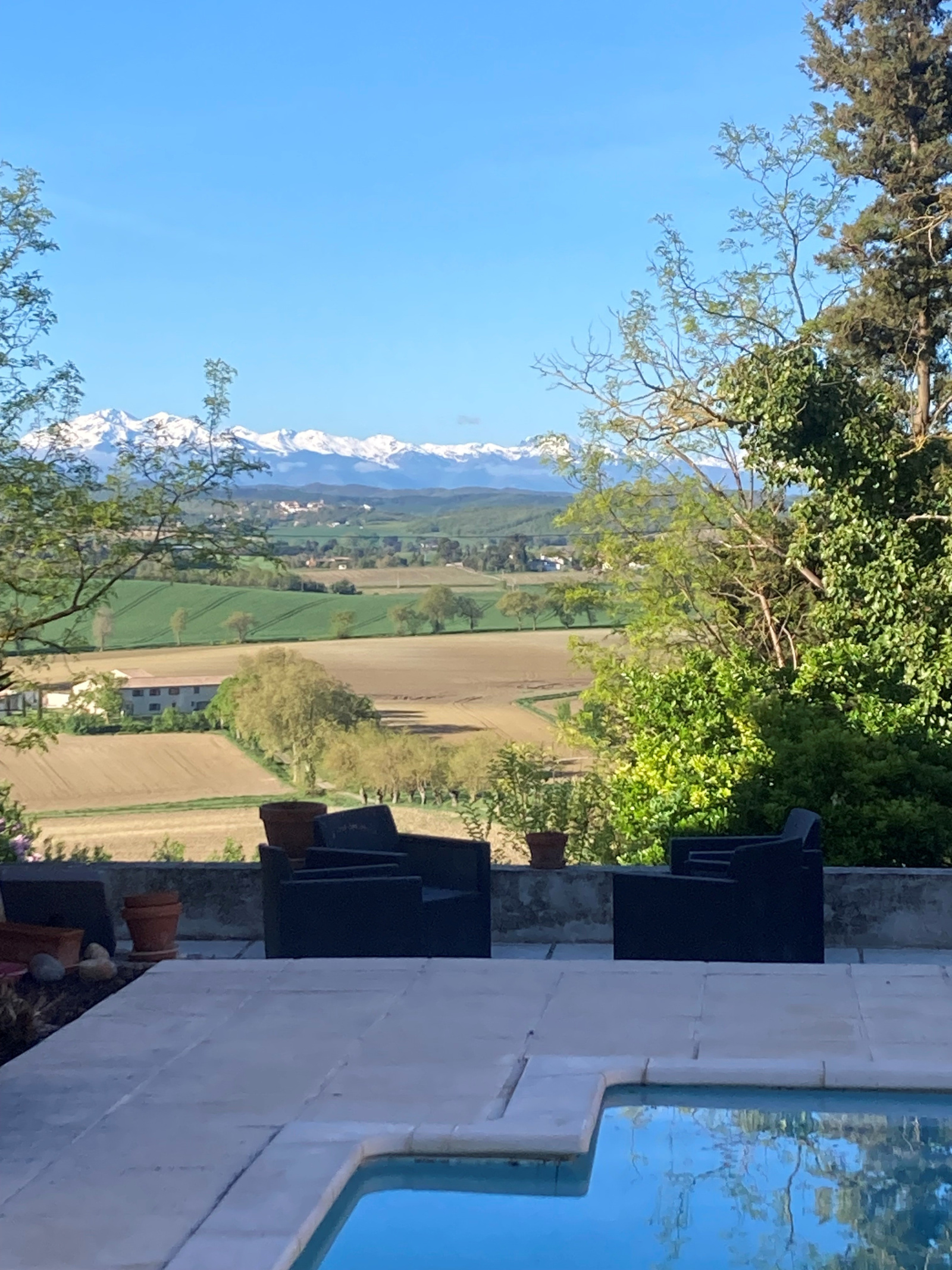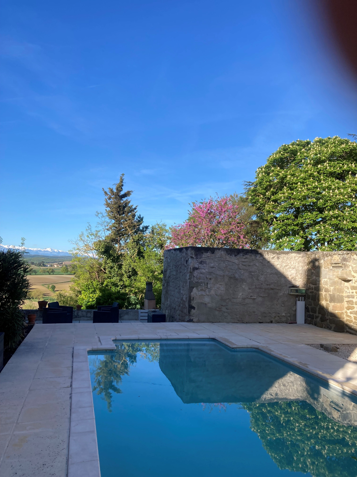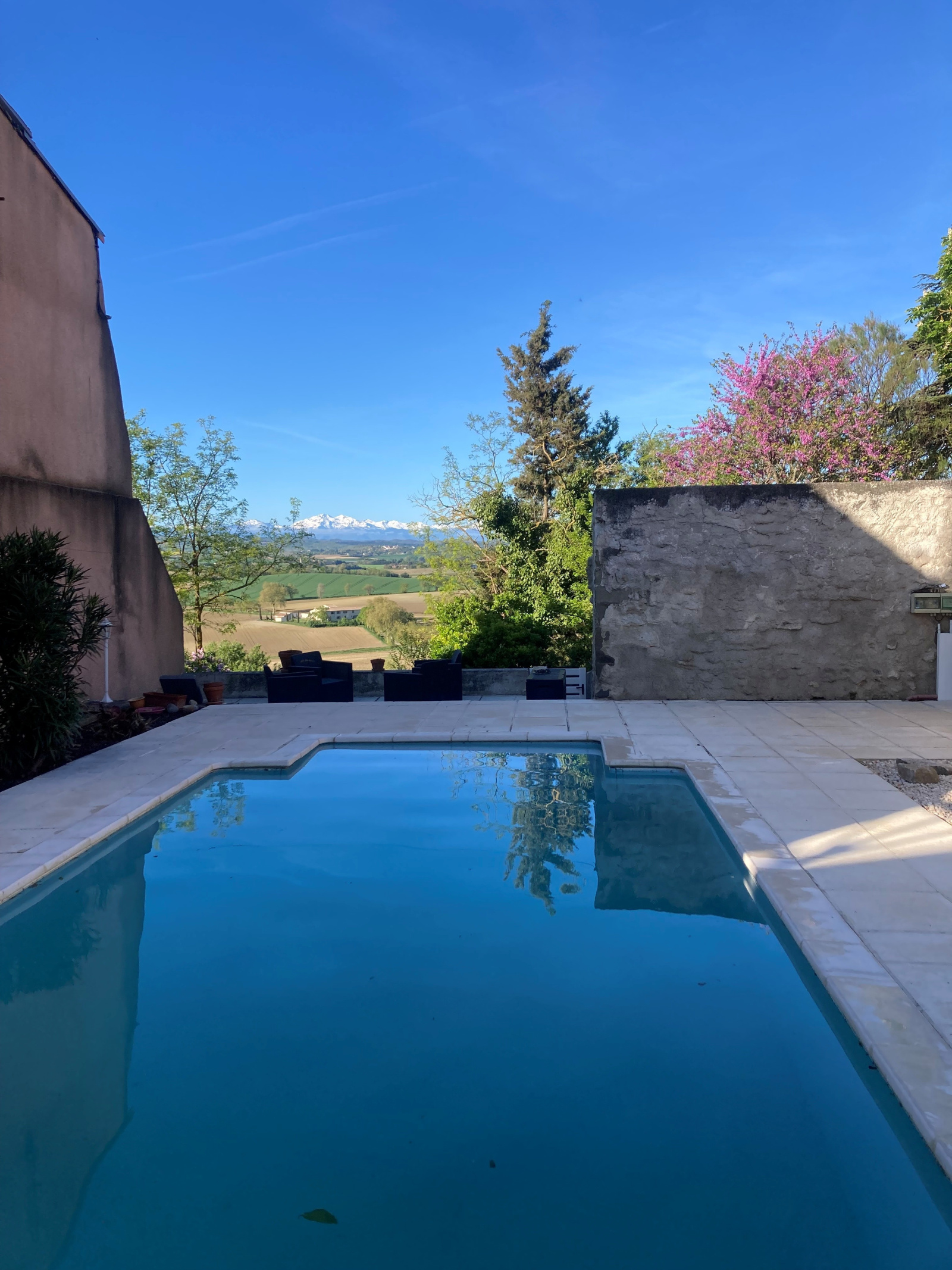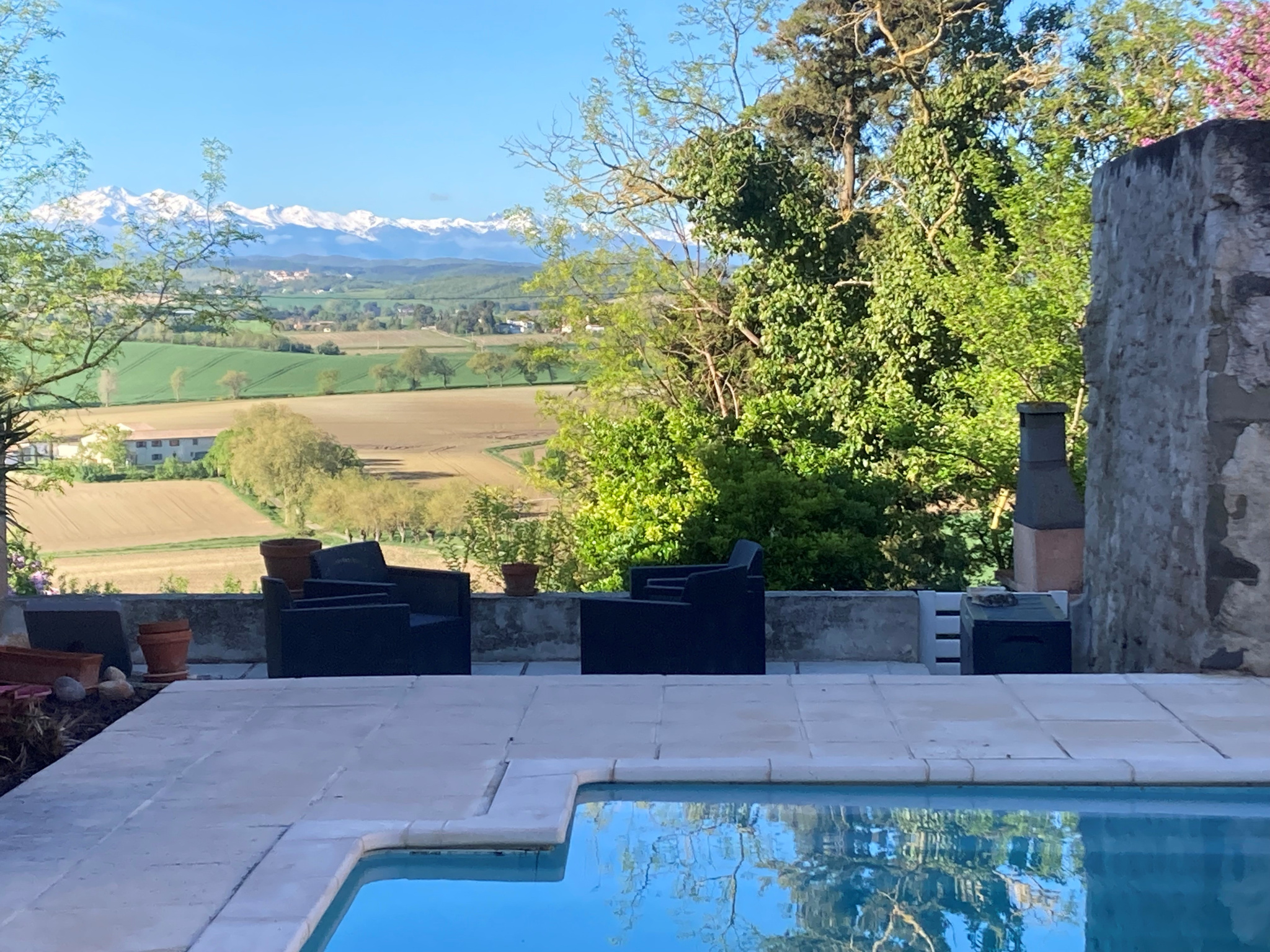 En face, terrasse certie de murs en pierre, avec piscine, qui s'ofrre une superbe vue sur les Pyrénées.