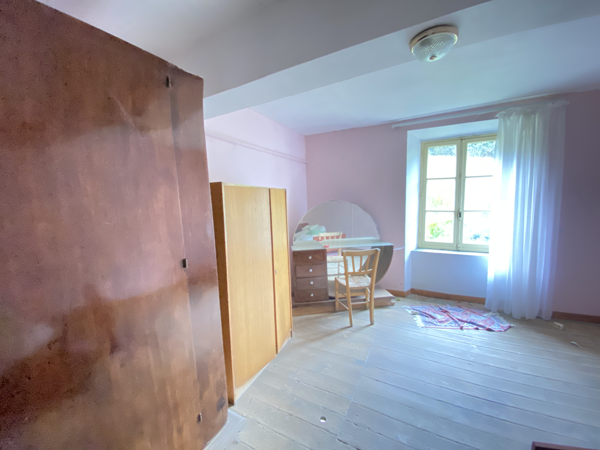 118m², anciennement habitée, 400 m² de dépendances (greniers et granges), le tout sur un terrain composé de champs et de bois.